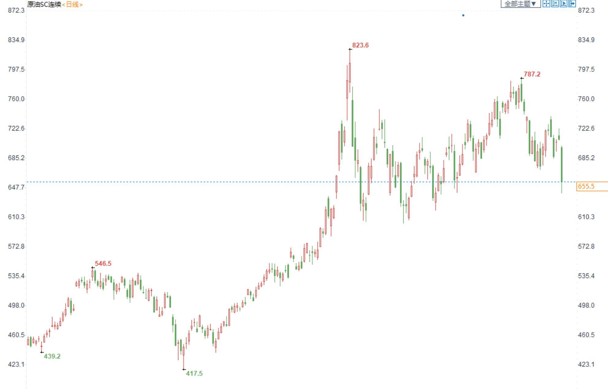 周三(7月6日)上海原油价格收盘大跌59.2元,跌幅8.28%。主力合约2209终盘收于655.5元/桶,跌59.2元/桶。油价大幅收跌,主要因市场对全球经济放缓的担忧重燃,这给油价短线沉重压力。