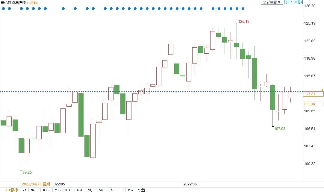 (布伦特原油主力合约日线图)北京时间6月27日11:37,布伦特原油主力合约价格报113.28美元/桶。