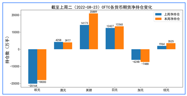 据美国商品期货委员会公布的2022-08-23期货市场头寸持仓报告显示,上周各货币的报告总持仓情况如下:欧元净多头变化2164手,澳元(0.6863, 0.0012, 0.18%)净空头变化281手,英镑净多头变化6716手,日元净多头变化938手,加元净空头变化1240手,纽元净多头变化1561手,上周没有总持仓多空转换的货币。除此之外,单向总持仓变动超过20%的货币有:英镑,纽元。